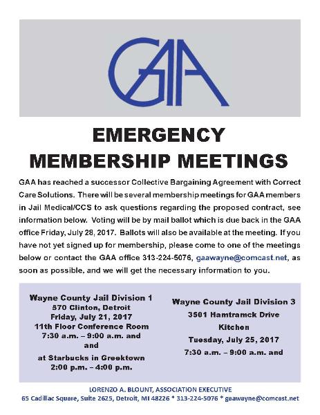 Click here for copy of the language that was tentatively agreed to by the parties, as well as a ratification ballot. We ask that you make every effort to attend one of these important meetings. Should you have questions or concerns regarding the proposed agreement or your ballot, please contact the GAA Office 313-224-5076, gaawayne@comcast.net.