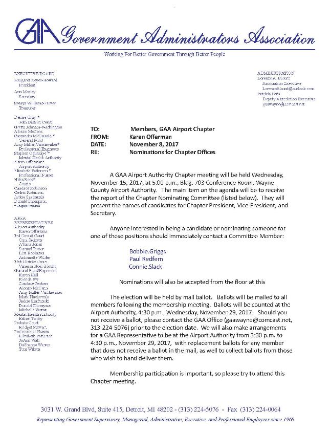 The GAA Wayne County Airport Authority Chapter election is scheduled for November 2017. The Chapter will be electing their President, Vice-President, and Secretary. A membership meeting will be scheduled in mid-November to solicit nominations. A notice will be mailed shortly with additional details.