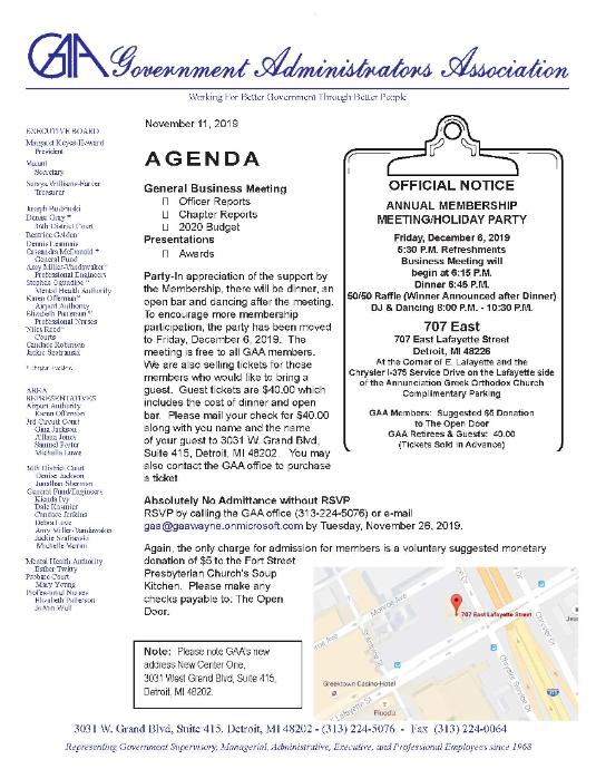 Party- In appreciation of the support by the Membership, there will be dinner, an open bar and dancing after the meeting. To encourage more membership participation, the party has been moved to Friday, December 2, 2016. We are selling tickets for those members who would like to bring a guest and GAA Retirees. Tickets for Guests and retirees who retired before 2015 are $50.00 which includes the cost of dinner and open bar. Click here for ticket form. Please mail your check for $50.00 along with the attached Ticket Request form to 65 Cadillac Square, Suite 2625, Detroit, MI 48226, and we will mail your tickets. You may also purchase tickets at the GAA office.